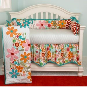 A quality baby bedding set is essential in making your nursery warm and inviting. Cotton Tale uses quality materials and unique designs to create your perfect nursery. The Lizzie 3 piece set has lots of color in a bright cotton motif. The 3 pc set contains fitted crib sheet, dust ruffle, and coverlet. Large appliquéd daisies on a patchwork of big dot red, small red dot and a fancy contemporary floral. Sculptured dust ruffle with turquoise trim. Soft dot sheet 100%, 200 thread count cotton. Wash gentle cycle, separate, cold water. Tumble dry low or hang dry. This collection is perfect for your little girl. Bumper not included in this set. Product Dimensions: 19" length x 19" width x 9" height 6 lbs.