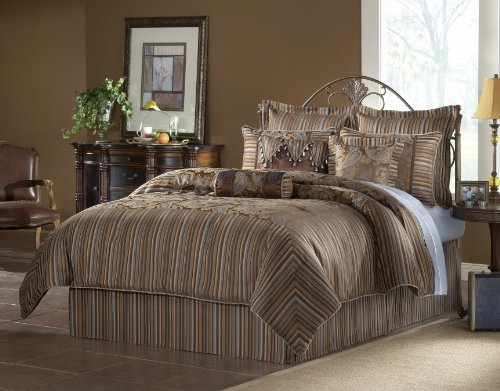 This toffee brown set has a paisley design in subtle light blue and gold. The bed skirt uses the same colors but is a stripe design. Decorative accent pillows are composed of a square accent, rectangular accent with tassels, and a neck roll pillow.